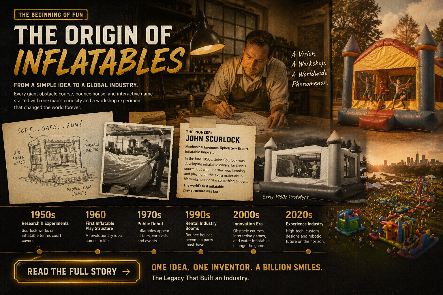 The story of inflatable games starts with a mechanical engineer and upholstery expert named John Scurlock.